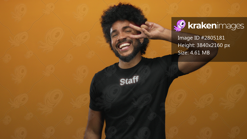 Man smiling in staff uniform against vibrant orange wall, expressing joy and positivity with a cheerful gesture, highlighting a welcoming and friendly atmosphere. - Kraken Images