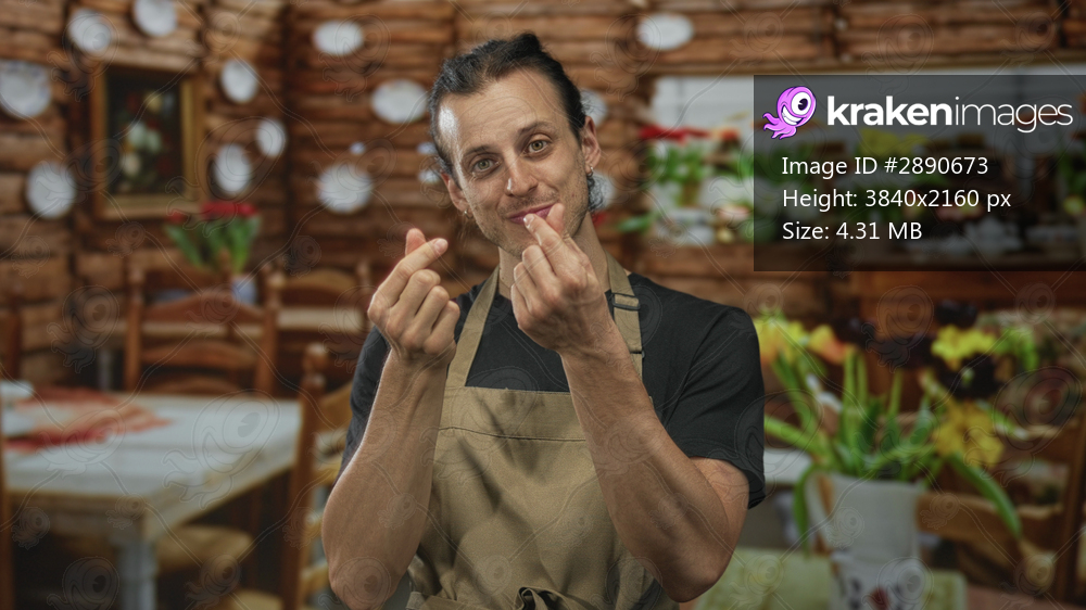 Man smiling in tan apron making finger heart gesture in cozy wood paneled restaurant interior with flowers on tables and stacked plates; warm hospitality. - Kraken Images