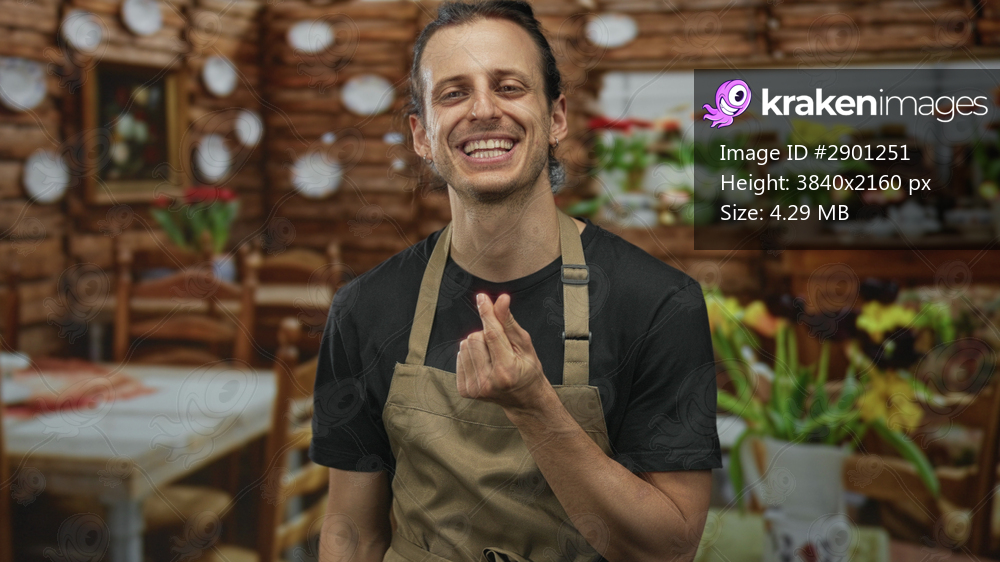 Man smiling in tan apron making finger heart gesture in cozy wood paneled restaurant interior with flowers on tables and stacked plates; warm hospitality. - Kraken Images