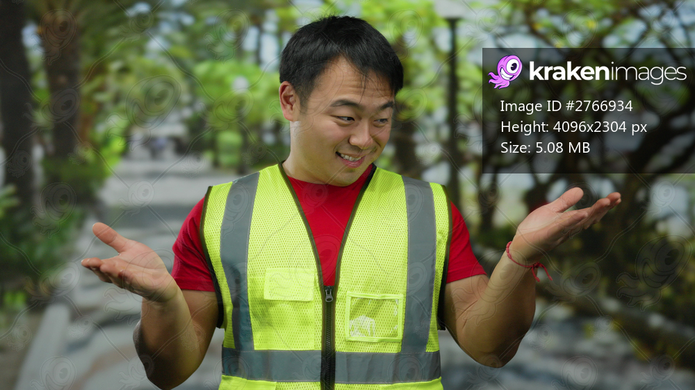 Man smiling in urban street setting wearing reflective vest, young adult with hands open, outdoors under green trees.