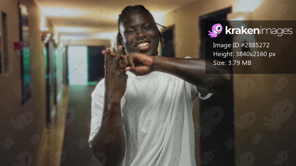 Man smiling in white t shirt makes hashtag sign with hands in hotel building corridor; joy confidence.