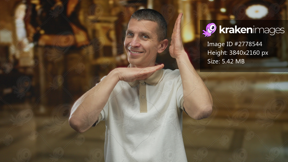 Man smiling indoors gesturing in a church setting with warm lighting capturing a casual moment of expression.
