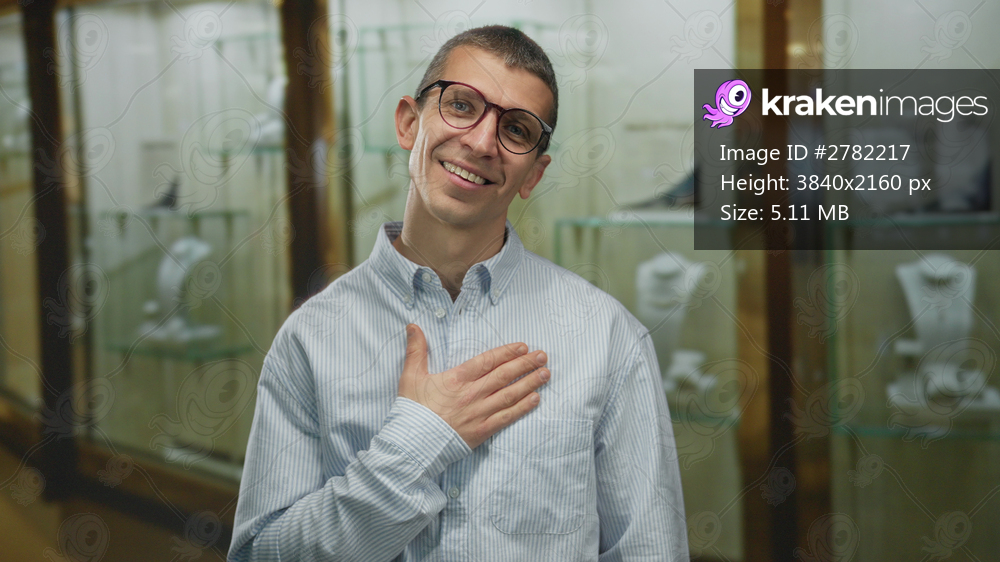 Man smiling indoors near jewelry showcase wearing glasses and striped shirt with one hand on chest in a store setting expressing satisfaction and positive emotion. - Kraken Images