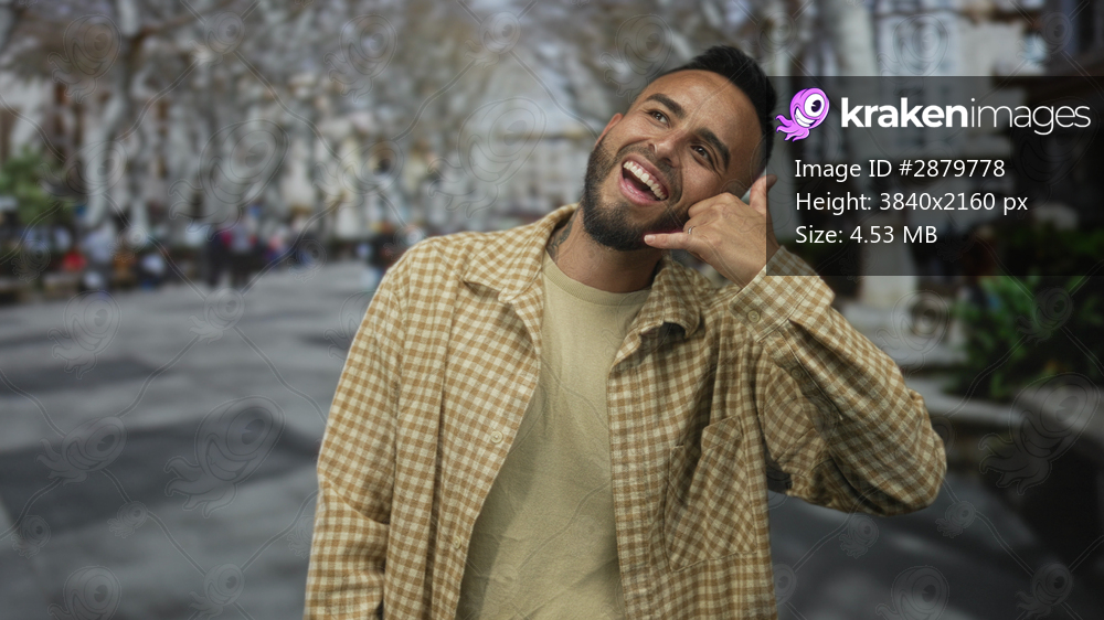 Man smiling and laughing while making call me gesture with his hands and pointing finger to thumb on busy city street lined with trees; playful joy.