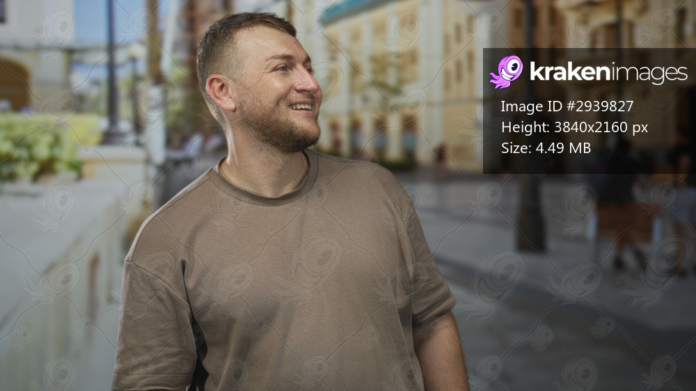Man smiling and looking sideways on a city street in a short sleeved brown t shirt, beard visible; contentment curiosity travel.