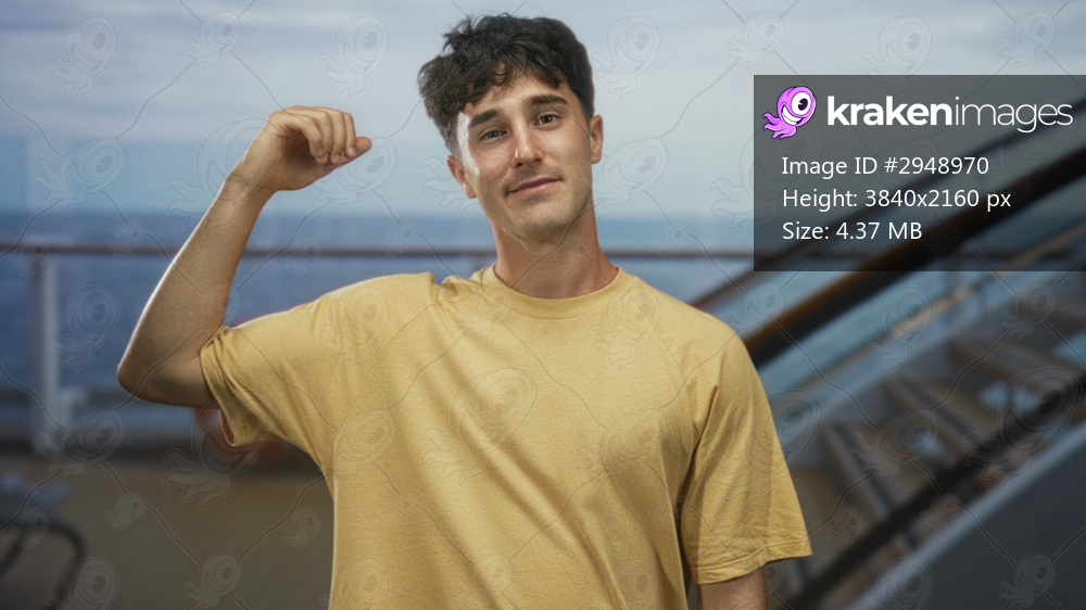 Man smiling and looking to the side on cruise deck with lifebuoy and stair railing visible, face in frame; calm vacation.