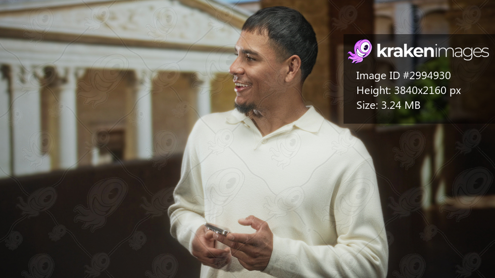 Man smiling and looking to the side while holding a smartphone with visible hands, wearing white sweater near classical columns in building; casual connection joy. - Kraken Images