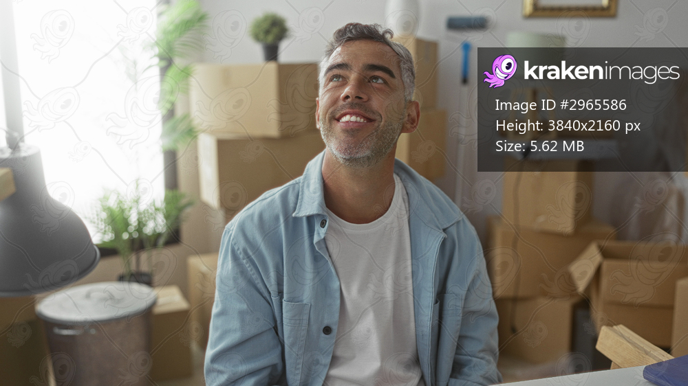 Man smiling and looking up amid stacked packing boxes in a building, seated at a desk wearing blue shirt and white tee; hope new beginning.