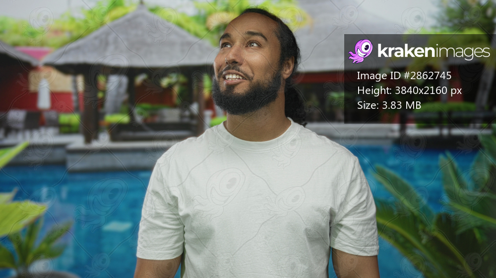 Man smiling and looking up beside pool in hotel building with cabanas and tropical plants; vacation ease contentment.