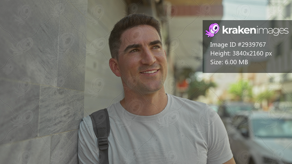 Man smiling and looking up, face turned toward sky with backpack strap on shoulder on street; hopeful curiosity.