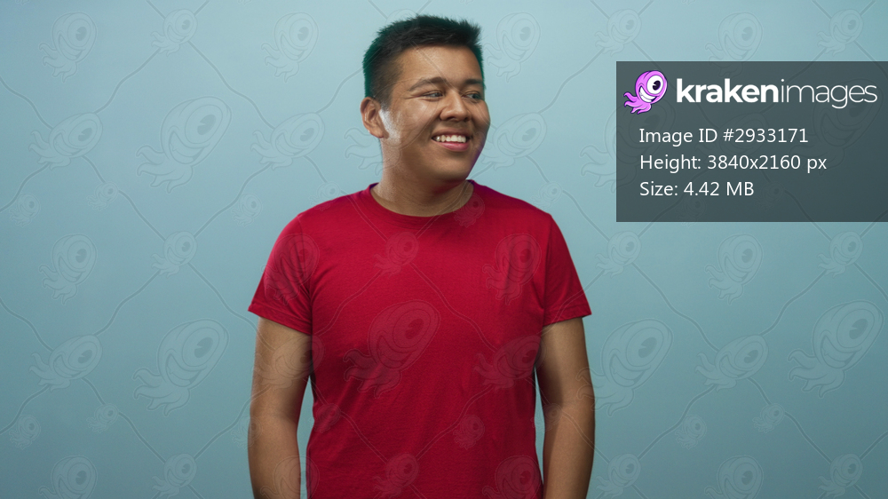 Man smiling and looking up with relaxed arms at sides wearing red tshirt in studio with light blue backdrop; optimism.