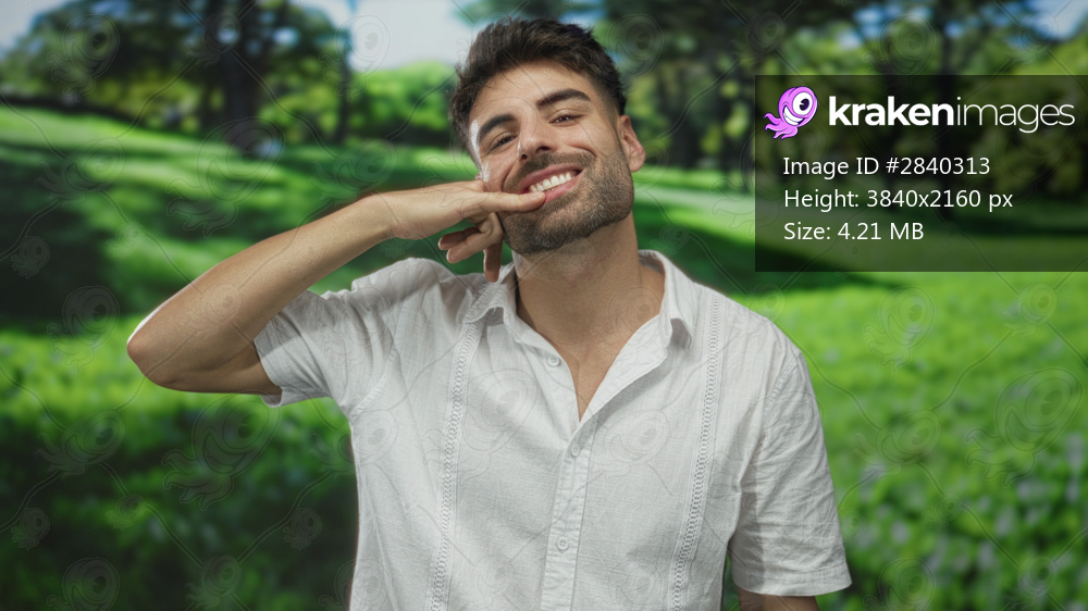 Man smiling makes call gesture with his hand near his face in green sunny park outdoors; communication happiness.