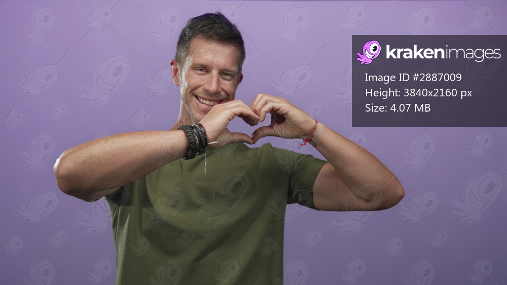 Man smiling and making heart with hands in studio wearing olive tshirt against purple backdrop; kindness connection.