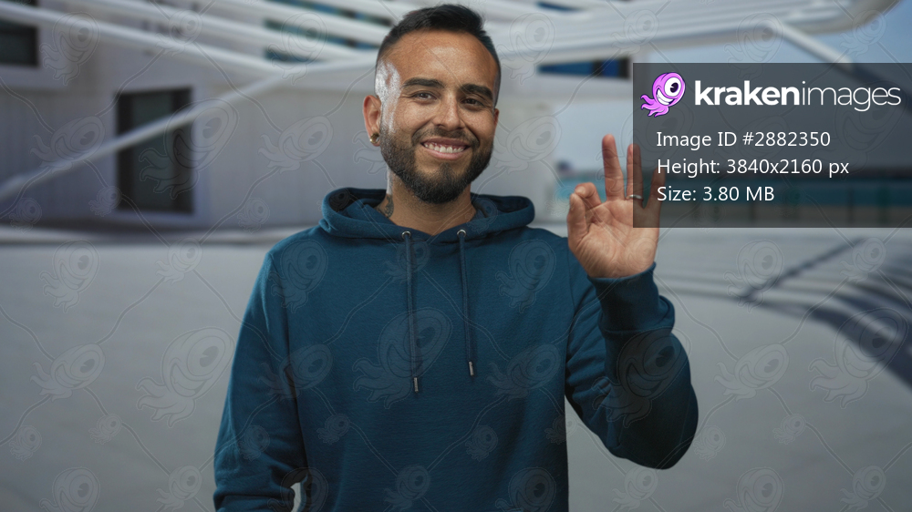 Man smiling and making ok sign with his right hand near face while wearing a teal hoodie in front of modern building with visible beams; confidence.