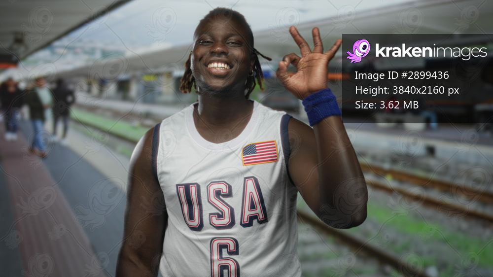 Man smiling and making ok sign with right hand on train station building platform; joy friendly optimism.