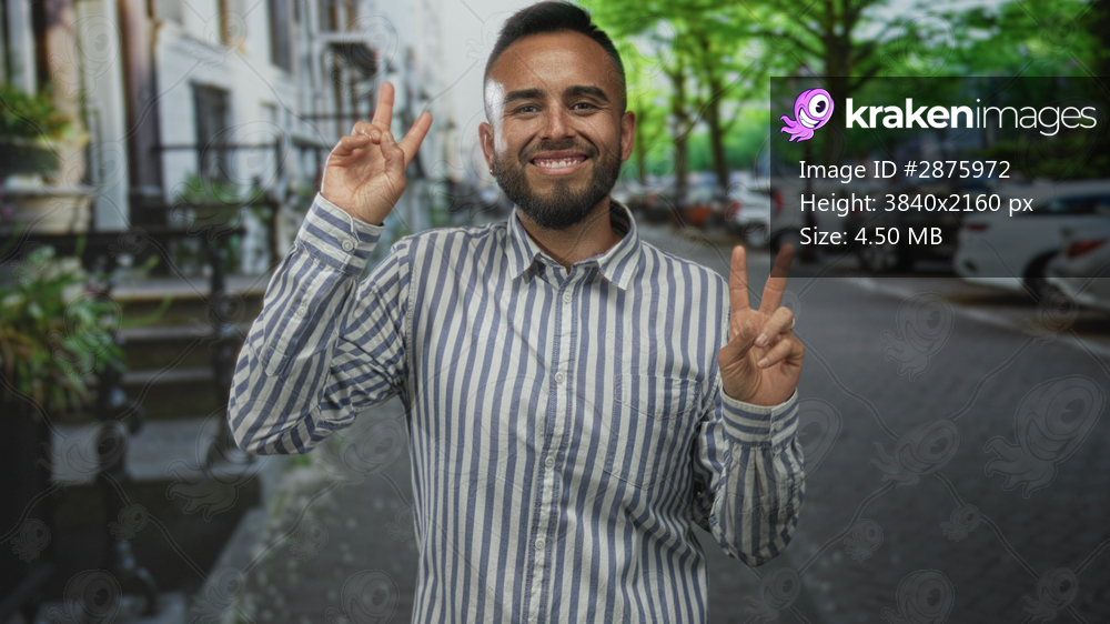 Man smiling and making peace signs with both hands on a tree lined city street near parked cars; urban joy.