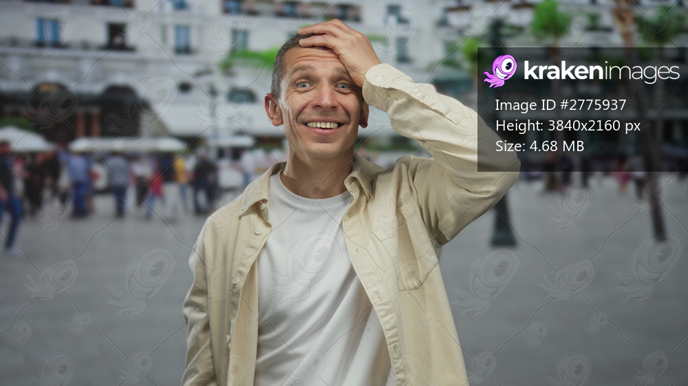 Man smiling on a busy outdoor street scene with blurred background, wearing casual clothing, portraying happiness and urban lifestyle on a lively caucasian populated street. - Kraken Images
