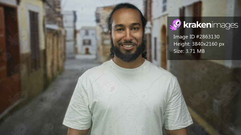 Man smiling on a narrow street with buildings and shuttered windows, wearing a white shirt and showing a full beard; friendly confidence.