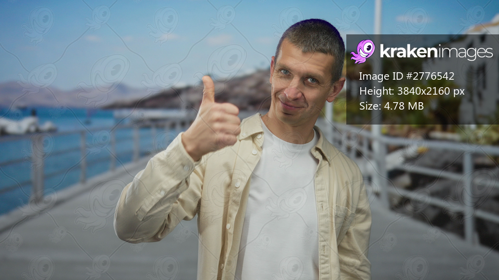 Man smiling on beach promenade with thumbs up gesture wearing beige shirt overlooking seaside scenery with clear sky and calm sea in background outdoors. - Kraken Images