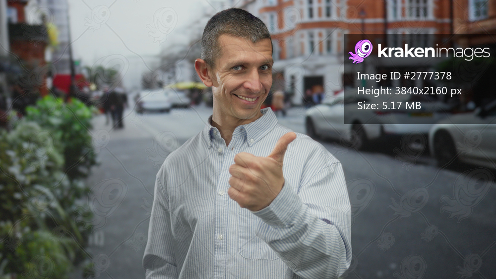Man smiling on busy street giving thumbs up with a wink, conveying positivity in an urban outdoor setting with cars and buildings in the background.