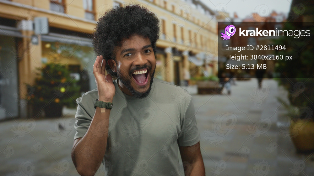 Man smiling on city street making gesture with thumb up and listening pose, surrounded by urban buildings.