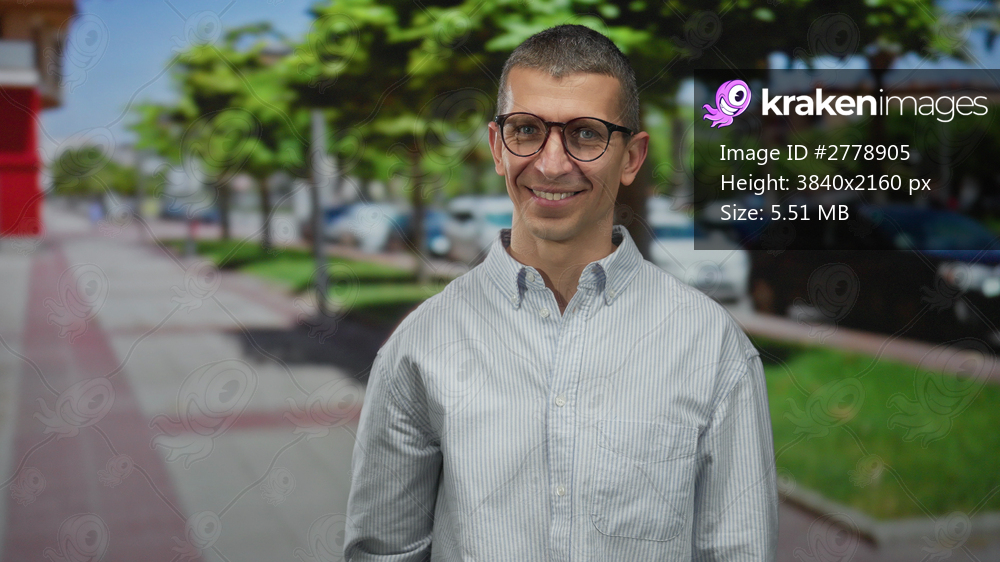 Man smiling on sunny street with trees and parked cars wearing glasses and striped shirt captures joyful outdoor urban scene.