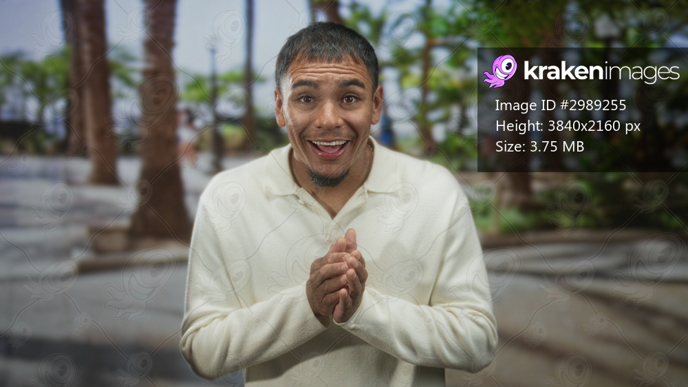 Man smiling with open hands and clapping gesture wearing cream sweater on street near palm trees and walkway; friendly welcoming joyful.