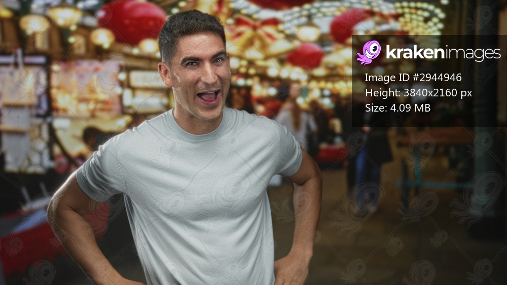 Man smiling with open mouth and hands on stomach in street market with hanging lights and souvenir stalls; joy.