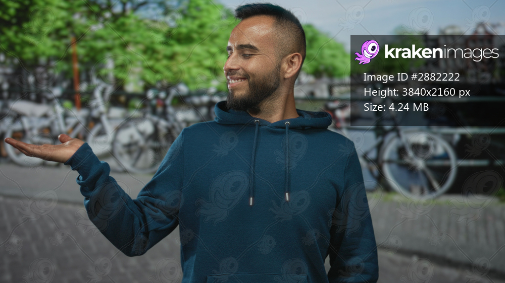 Man smiling with open palm on street in amsterdam by canal with parked bicycles, wearing blue hoodie; confidence ease welcome openness.