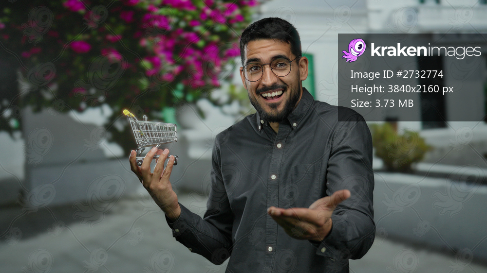 Man smiling outdoors holding a small shopping cart in an urban setting surrounded by vibrant flowers with a cheerful expression on his face.