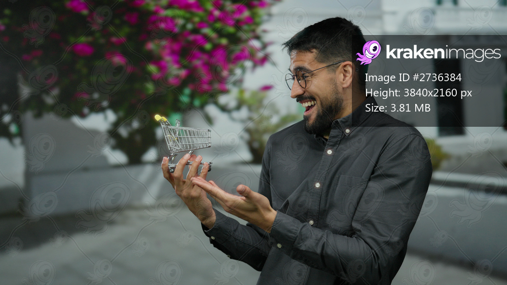 Man smiling outdoors holding a small shopping cart in an urban setting surrounded by vibrant flowers with a cheerful expression on his face.