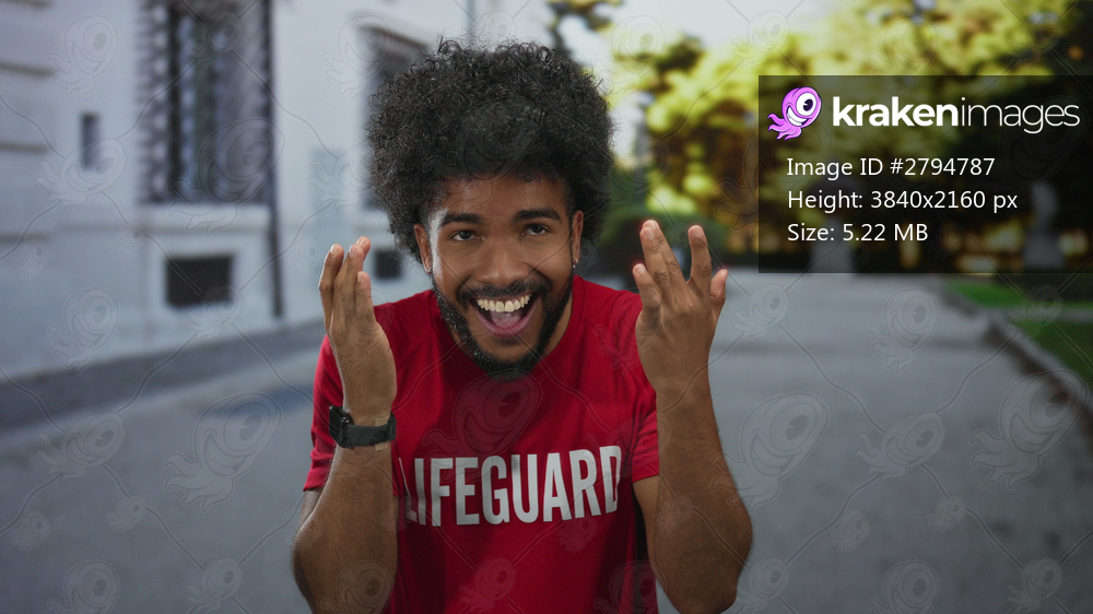 Man smiling outdoors in a city street wearing a lifeguard shirt, representing cheerful and positive urban lifestyle.