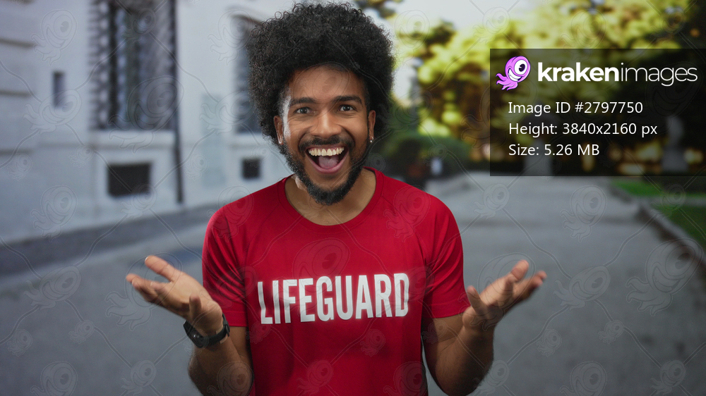 Man smiling outdoors in a city street wearing a lifeguard shirt, representing cheerful and positive urban lifestyle.