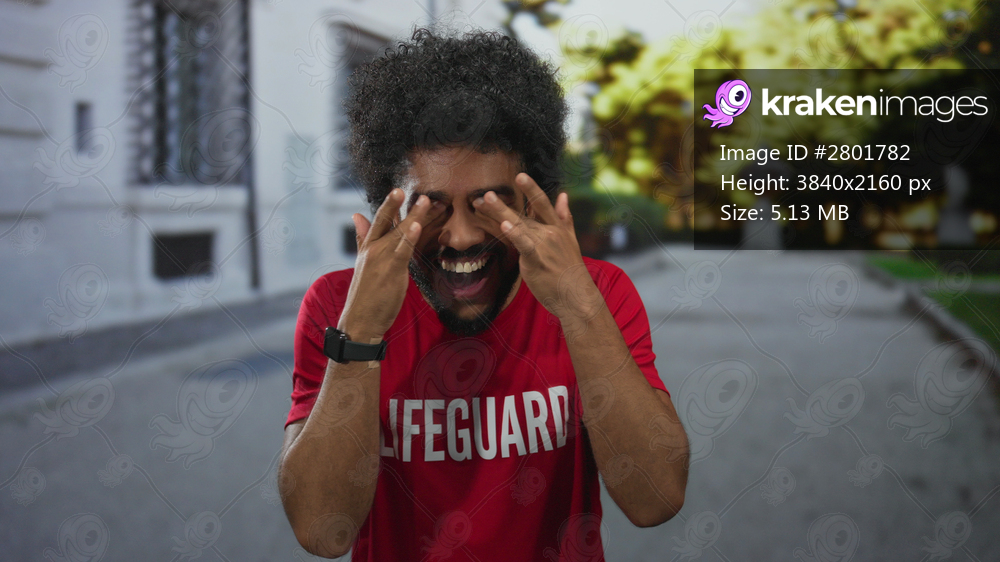Man smiling outdoors in a city street wearing a lifeguard shirt, representing cheerful and positive urban lifestyle.