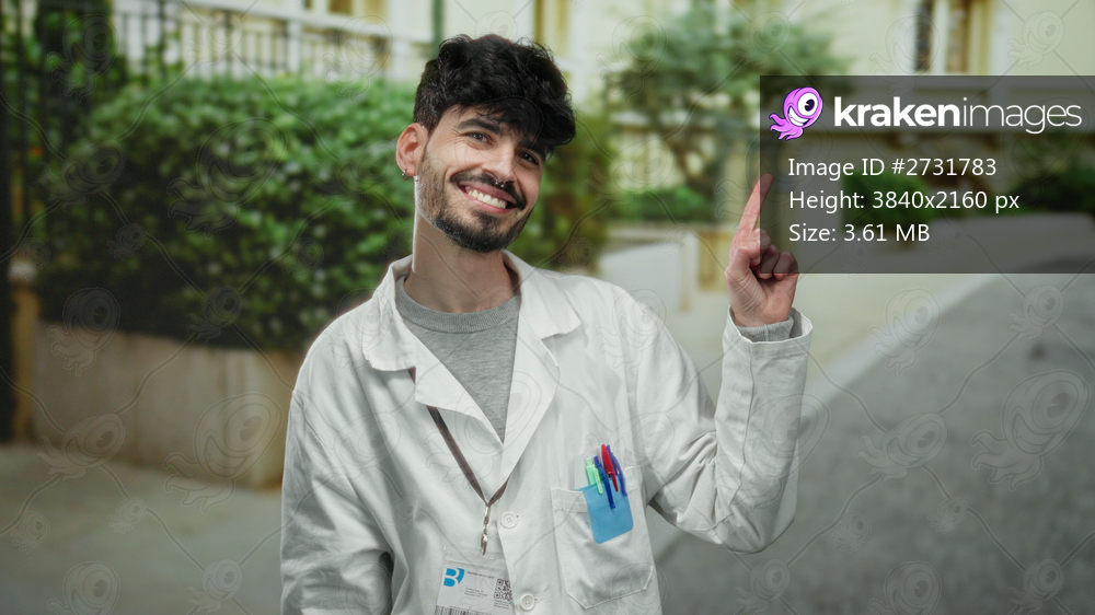 Man smiling outdoors in city street wearing white lab coat gesturing with hand, showcasing happiness and confidence in urban environment.