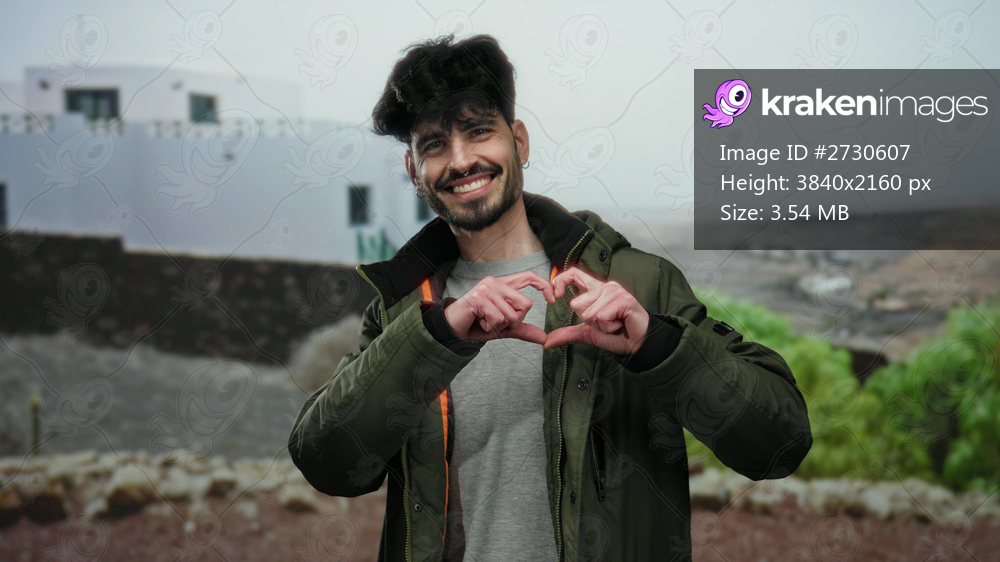 Man smiling outdoors in urban street making heart shape with hands, wearing jacket, with white building in background and greenery around, expressing happiness and love. - Kraken Images