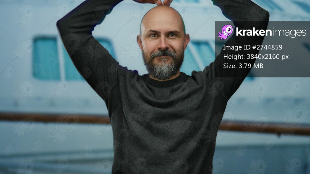 Man smiling outdoors on a cruise ship with a beard and a bald head, showcasing a seaside setting with a relaxed atmosphere against a backdrop of maritime elements. - Kraken Images
