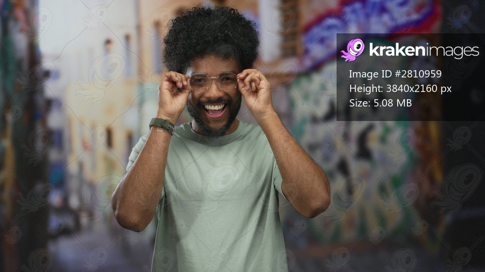 Man smiling outdoors on a lively city street, adjusting glasses, with colorful graffiti and urban background, exuding happiness and confidence.