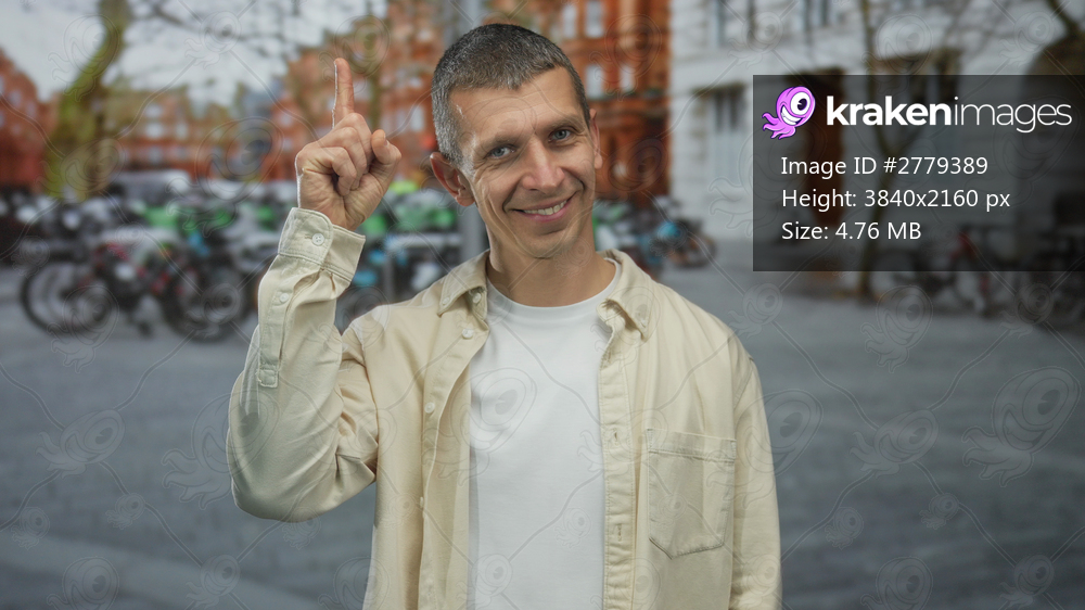 Man smiling outdoors on street pointing upward wearing casual shirt with bicycles in background creating a serene urban atmosphere