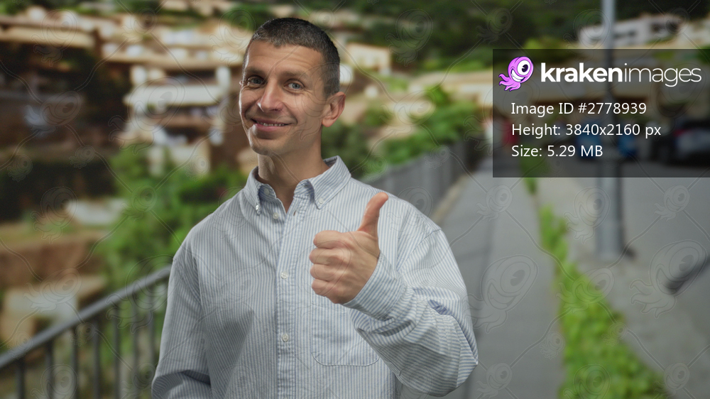 Man smiling outdoors showing thumbs up on urban street with blurred background, wearing casual shirt, expressing positivity in bright daylight setting. - Kraken Images