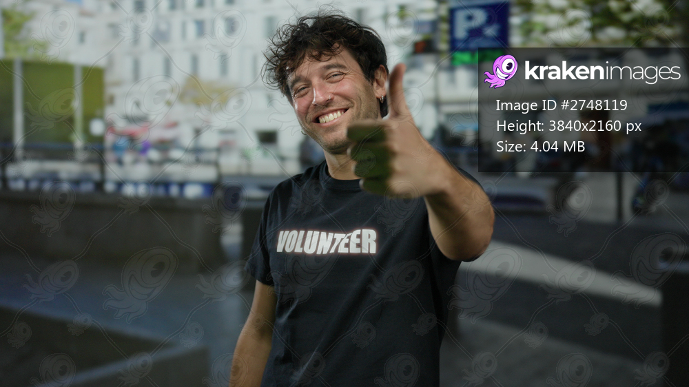 Man smiling outdoors wearing volunteer shirt giving thumbs up on city street.