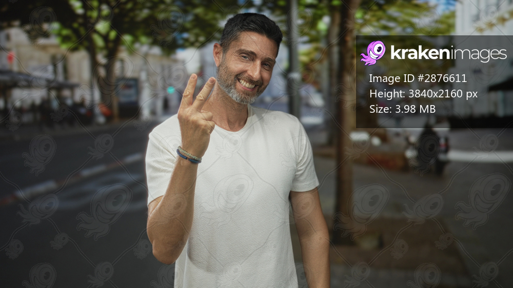 Man smiling pinching two fingers with right hand, bracelets on wrist, standing on a city street lined with trees and buildings; confidence invitation.
