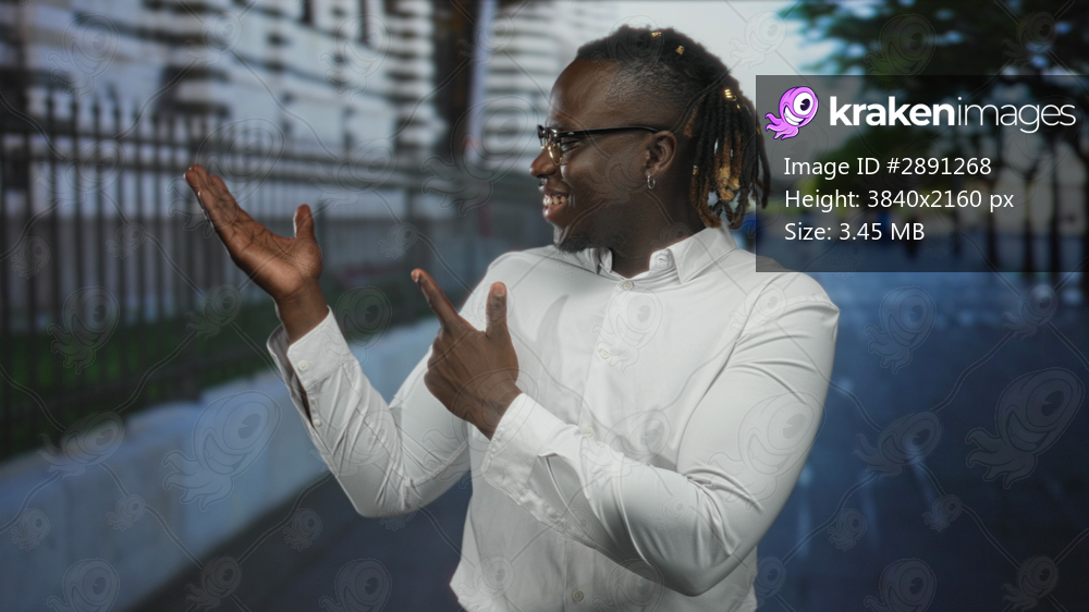 Man smiling and pointing at his open palm on street near iron fence, wearing glasses and white shirt; joy confidence.
