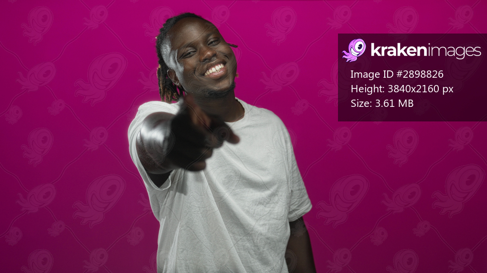 Man smiling and pointing finger directly at camera in studio with a vibrant magenta backdrop and white t shirt visible; joy confidence.
