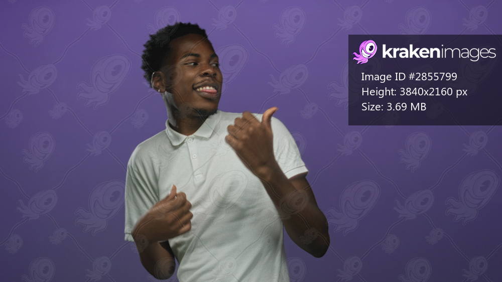 Man smiling and pointing finger in studio with purple backdrop showing a playful pointing gesture; confidence.