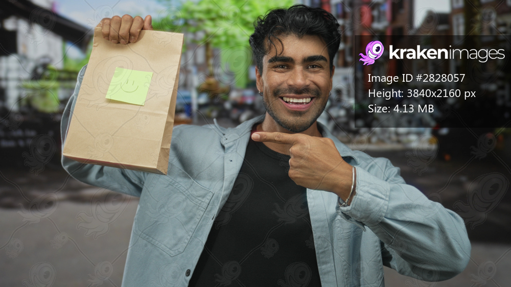 Man smiling and pointing finger to cardboard bag with smiley sticky note on crowded city street in bright daylight; happiness.
