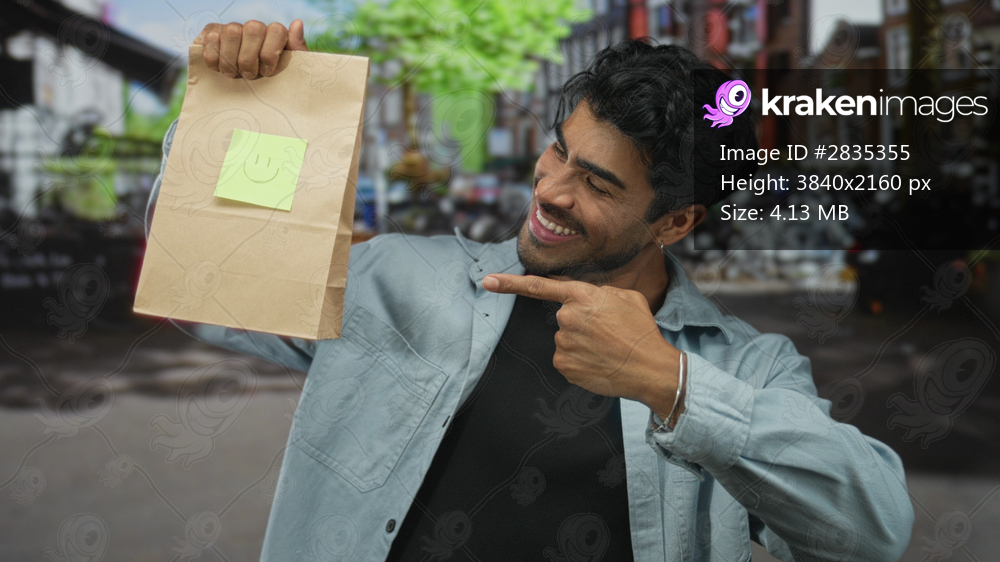 Man smiling and pointing finger to cardboard bag with smiley sticky note on crowded city street in bright daylight; happiness.