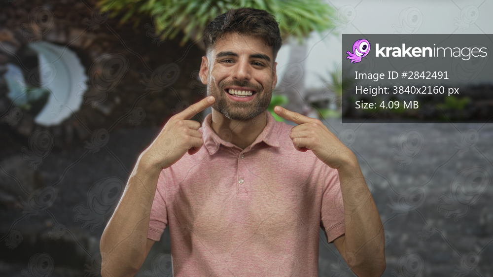 Man smiling and pointing finger to mouth in casual pink polo shirt on street outdoors near palm tree; joy.