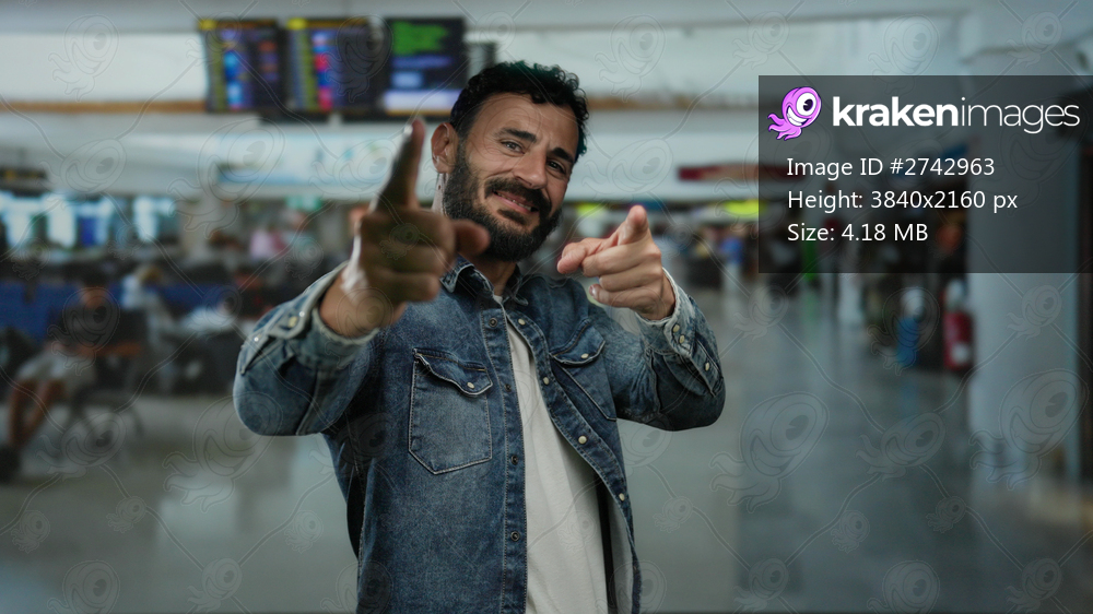 Man smiling and pointing playfully in airport terminal with busy background of travelers and departure boards.