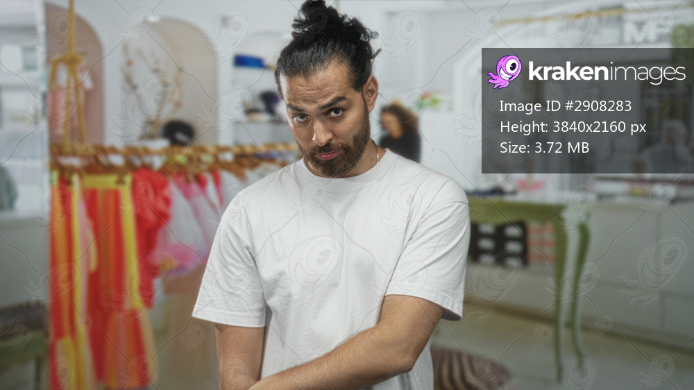 Man smiling and pointing to shoulder while wearing a white t shirt inside a clothing store building with colorful racks and a boutique counter; playful shopping. - Kraken Images